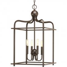 Assembly Hall provides a formal and classic open caged pendant for a variety of traditional and transitional interiors. This Design Series collection features arching frames that are great in scale and surround a candelabra cluster with matching candles. Optional Antique Brass candle covers included for varied look. Six-Light Antique Bronze Foyer Pendant.